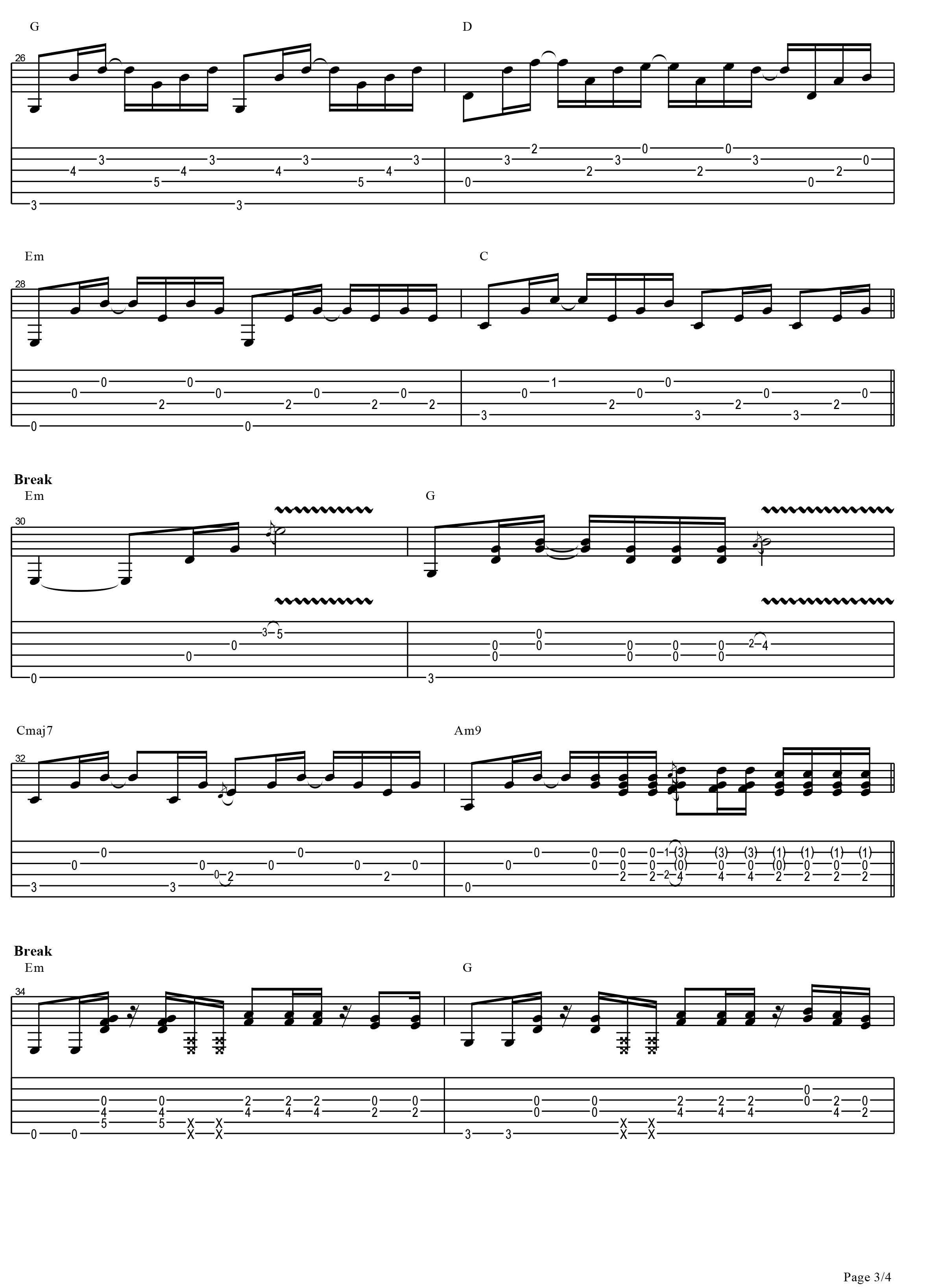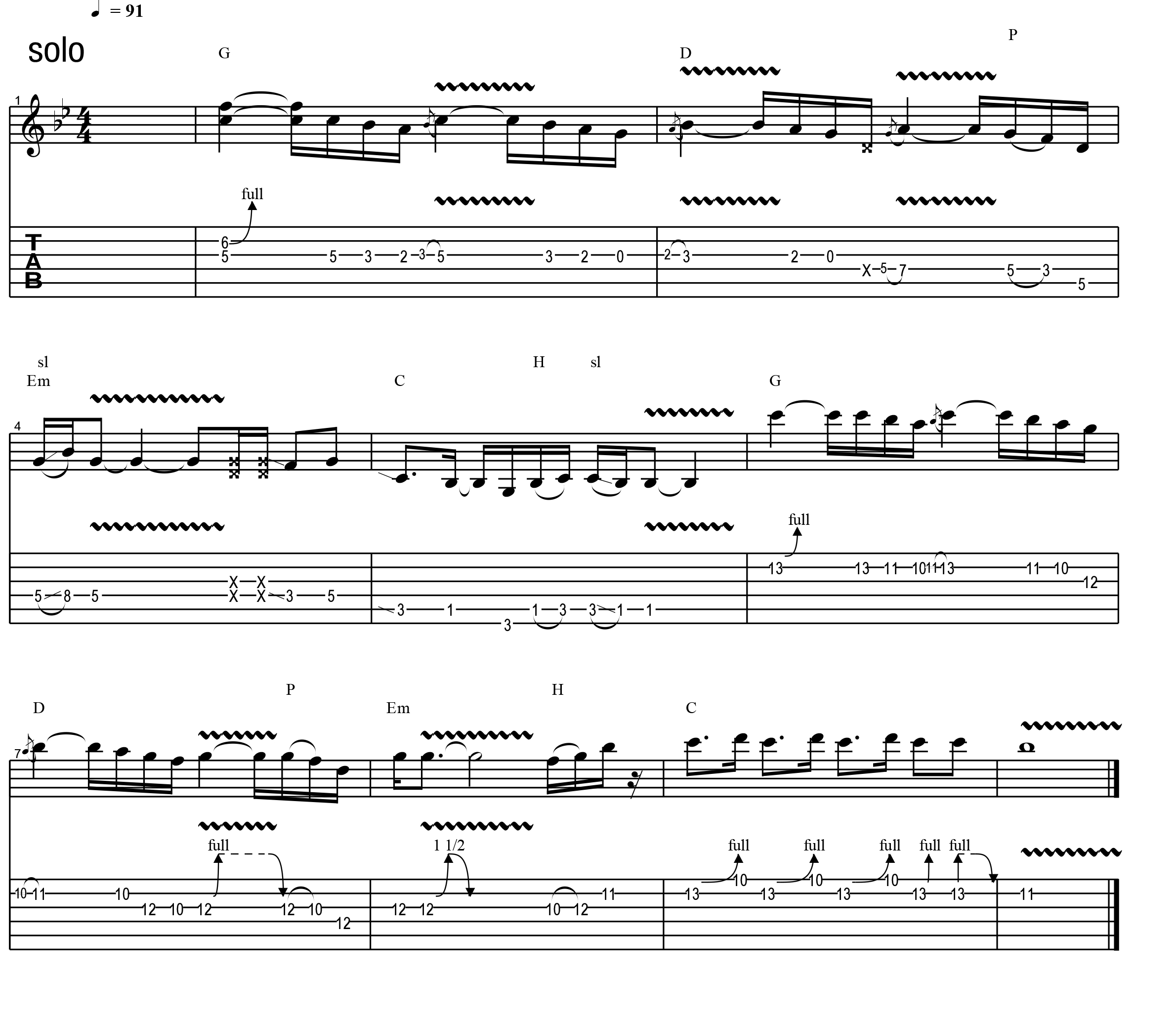 Solo : จะเป็นการโซโล่ใน Box ของ G Minor เริ่มจาก Unison Bend ก่อน แล้วเล่นจากเฟร็ต 5 สาย 3 มาถึงสายเปิด ถัดมาก็จะเป็นการเล่นเมโลดี้ มาเรื่อยๆ ตาม Tab จากนั้นจะย้ายมาเล่นตรงเฟร็ต 10-13 สาย 2 จะมีการเล่นดันสายผสมกับเล่นเมโลดี้ โดยรูปแบบการดันสายในท่อนนี้จะไม่ใช่ดันสายไปตรงๆ แต่จะค่อยไต่ระดับเสียงขึ้นไป ผสมกับการเล่นเมโลดี้