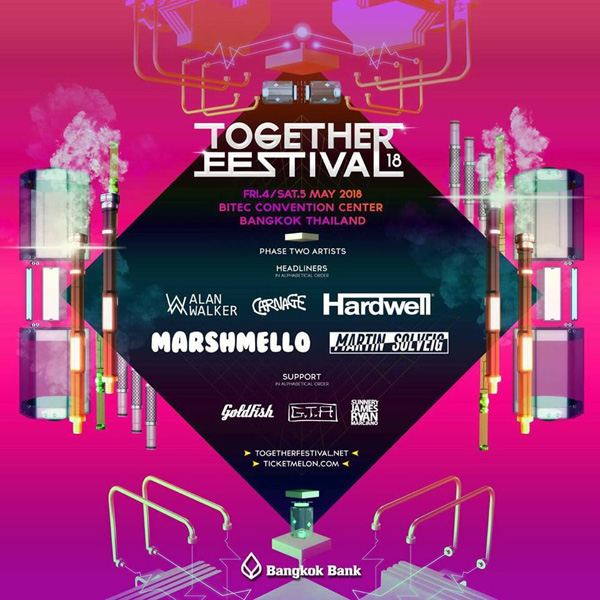 Together Festival 2018 แดนซ์ยับ 2 วันเต็ม 4-5 พฤษภาคม 2561 ณ ไบเทค บางนา รีบซื้อบัตรด่วน ราคาบัตรเฟสสอง บัตรท่านละ 2,895 บาท และบัตรกรุ๊ป 6 ท่าน ราคา 17,091 บาท จำหน่ายแล้วทาง www.togetherfestival.net และ www.ticketmelon.com รีบซื้อด่วนก่อนบัตรหมด พิเศษสุด ซื้อบัตรผ่าน Debit / Credit ของธนาคารกรุงเทพ รับส่วนลดไปเลย 10%