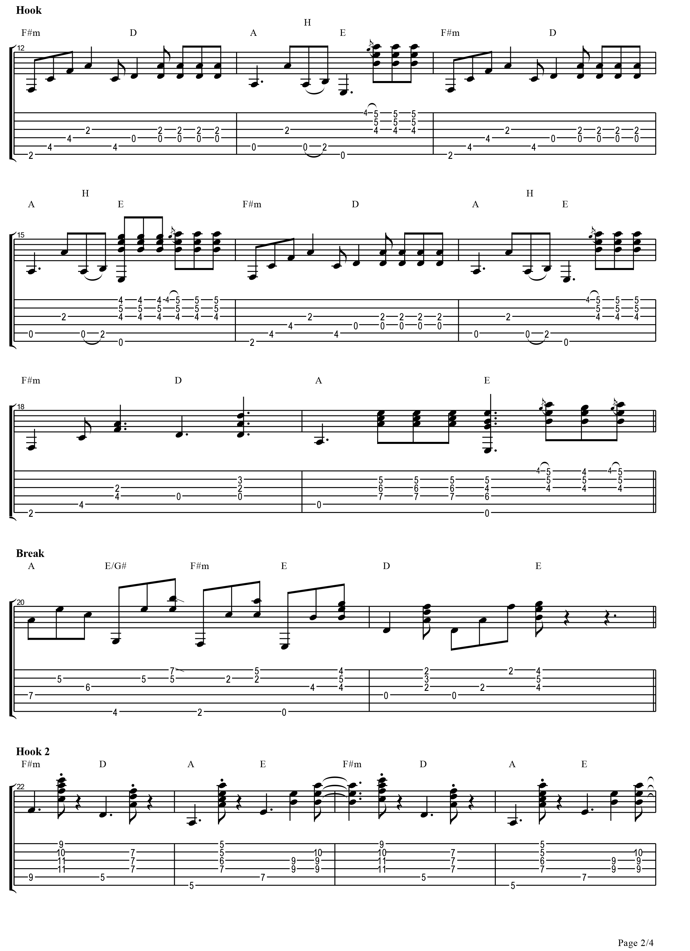 Hook 2 : จะเล่นเป็น Rhythm ตัวเบส ผสมกับการดีด Rhythm สั้นๆ ในจังหวะที่ 2 กับ 4 เยอะ แต่ที่พิเศษขึ้นมาคือจะมีตัว Triad ที่ค้างไปอยู่ในบีทที่หนึ่งของห้องต่อไปอยู่ด้วย