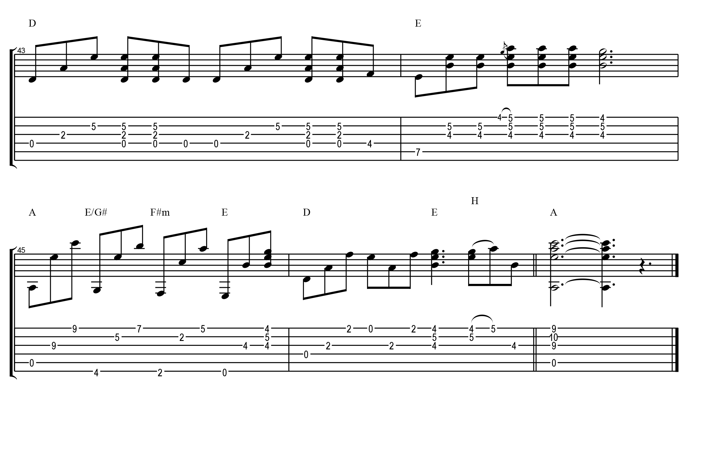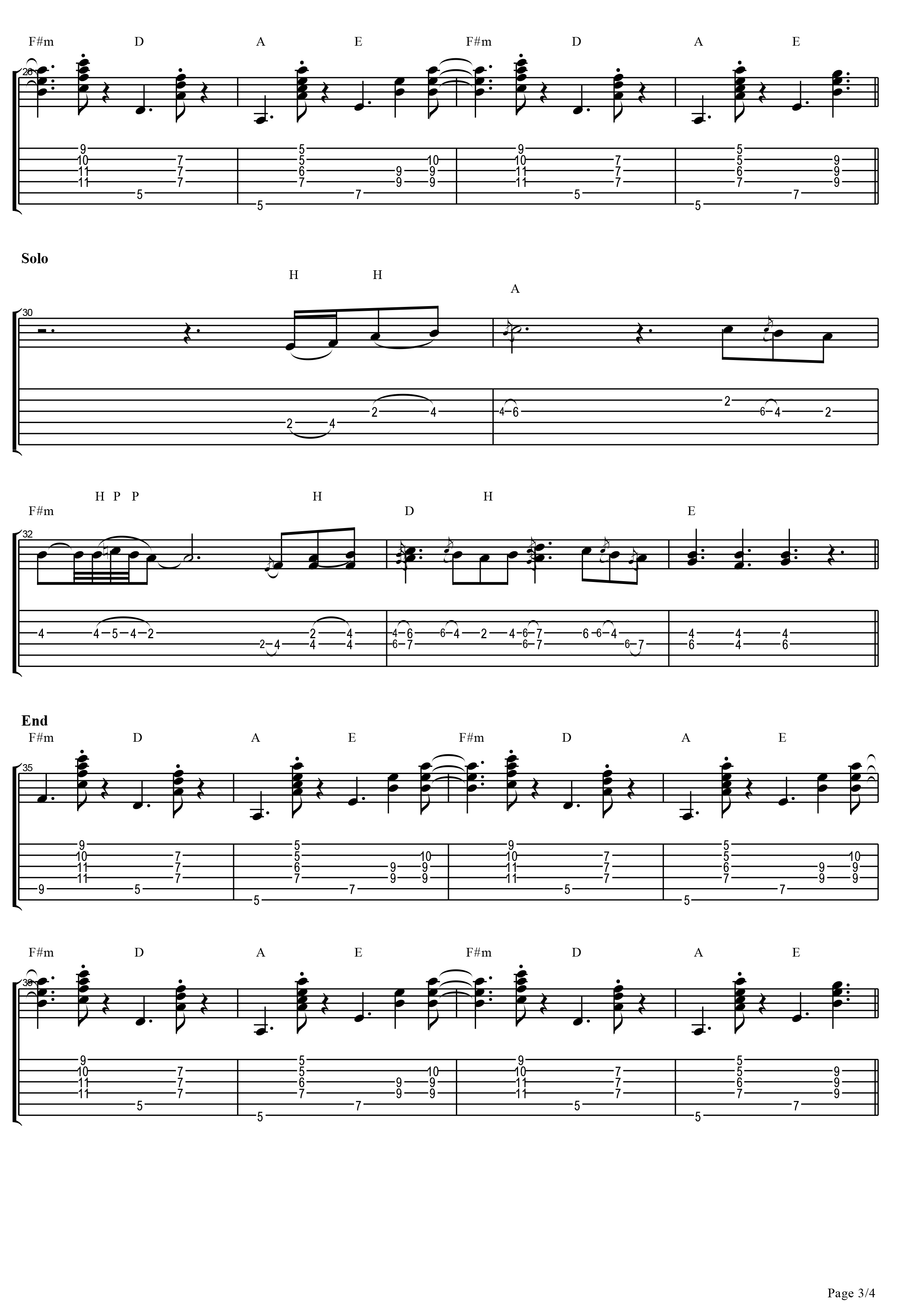 Verse : ในท่อนนี้จะเหมือนเป็นการ Picking ผสมสตรัมเล็กน้อย โดยที่จะดีดเบส และเล่น Picking ในโน้ต 3 สายล่าง โดยใช้นิ้วชี้ กลาง นาง ในการเล่น เพื่อดีดเกี่ยว 3 สายล่าง ในจังหวะแบบส่วนโน้ต 12/8 (นับเป็น หนึ่ง และ และ สอง และ และ สาม และ และ สี่ และ และ) ท่อนหลังจะเป็นการสตรัม โดยที่โน้ตที่เป็นคอร์ด Triad จะดีดเป็นเสียงสั้นๆ ลงในจังหวะที่ 2 และ 4 โดยจะมีท่อนส่งเป็นการเล่นใน Triad คอร์ด E และ Esus4 โดยการเติมนิ้วก้อยด้วย