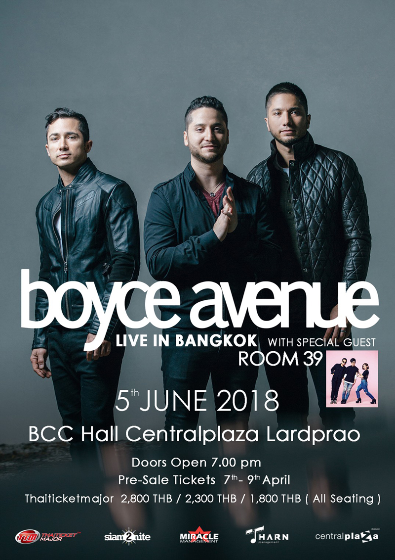 หลังจากประสบความสำเร็จอย่างท่วมท้น จากคอนเสิร์ตอินคิวบัสเมื่อเดือนกุมภาพันธ์ที่ผ่านมา “มิราเคิล แมเนจเมนท์” (Miracle Management) เครื่องร้อนเตรียมลุยต่อทันที ล่าสุดดึงศิลปินต่างประเทศขวัญใจวัยรุ่นทั่วโลกและโด่งดังสุดขีดอย่าง “Boyce Avenue” (บอยซ์ อเวนิว) วงป็อปสามพี่น้องสุดหล่อจากฟลอริด้าที่มาแรงและประสบความสำเร็จไปทั่วโลกจากการคัฟเวอร์เพลงดังมากมายลงยูทูป การันตีความเพราะขั้นเทพด้วยยอดวิวบนยูทูปเกิน 3.7 พันล้านวิว! และมีสมาชิกติดตามถึง 10.6 ล้านคนในยูทูป โดยจะเดินทางมาพบกับแฟนๆ ชาวไทยเป็นครั้งแรกโชว์เสียงร้องสด ภายใต้ชื่องาน “Boyce Avenue Live in Bangkok” (บอยซ์ อเวนิว ไลฟ์ อิน แบงคอก) ในวันอังคารที่ 5 มิถุนายน 2561 ณ บีซีซี ฮอลล์, เซ็นทรัล ลาดพร้าว บัตรราคา 2,800 / 2,300 / 1,800 บาท สำรองบัตรได้ที่ ไทยทิคเก็ตเมเจอร์ ทุกสาขา หรือ www.thaiticketmajor.com สอบถามโทร 0-2262-3838 ร่วมด้วยRoom39 ที่จะมาสร้างสีสันเล่นเป็นวงเปิดให้กับ Boyce Avenue