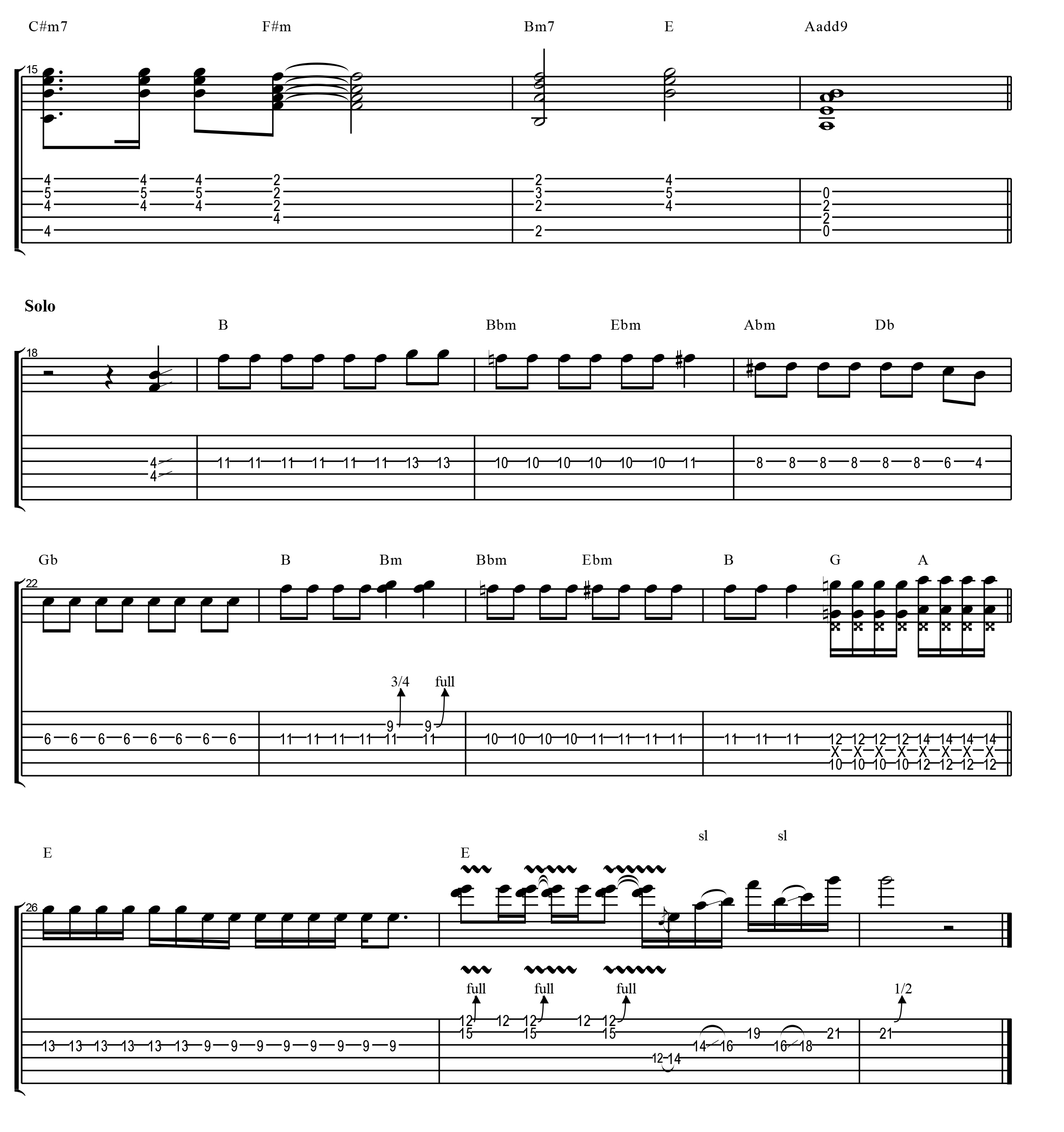 Solo : ท่อน Solo จะเป็นการเปลี่ยนคีย์ไปอยู่ในคีย์ Gb Major และเริ่มต้นด้วยคอร์ด 4 คือ B โดยเมโลดี้จะเป็นเขบ็ต 1 ชั้นง่ายๆ เล่นบนสาย 3 ซึ่งจะเป็นโน้ตที่อยู่ในคอร์ดเป็นส่วนใหญ่ มีการเล่น Unison Bend จากนั้นจะไปเล่นเป็น Octaveซึ่งเมโลดี้ตรงนี้จะกลับมาอยู่ในคอร์ด G และ A ก่อนส่งเข้าหา E เพื่อให้เข้ามาอยู่ในคีย์ปกติ ด้วยการดันสาย และจบด้วย Lick แบบ สไลด์ ดันสายในตอนท้าย
