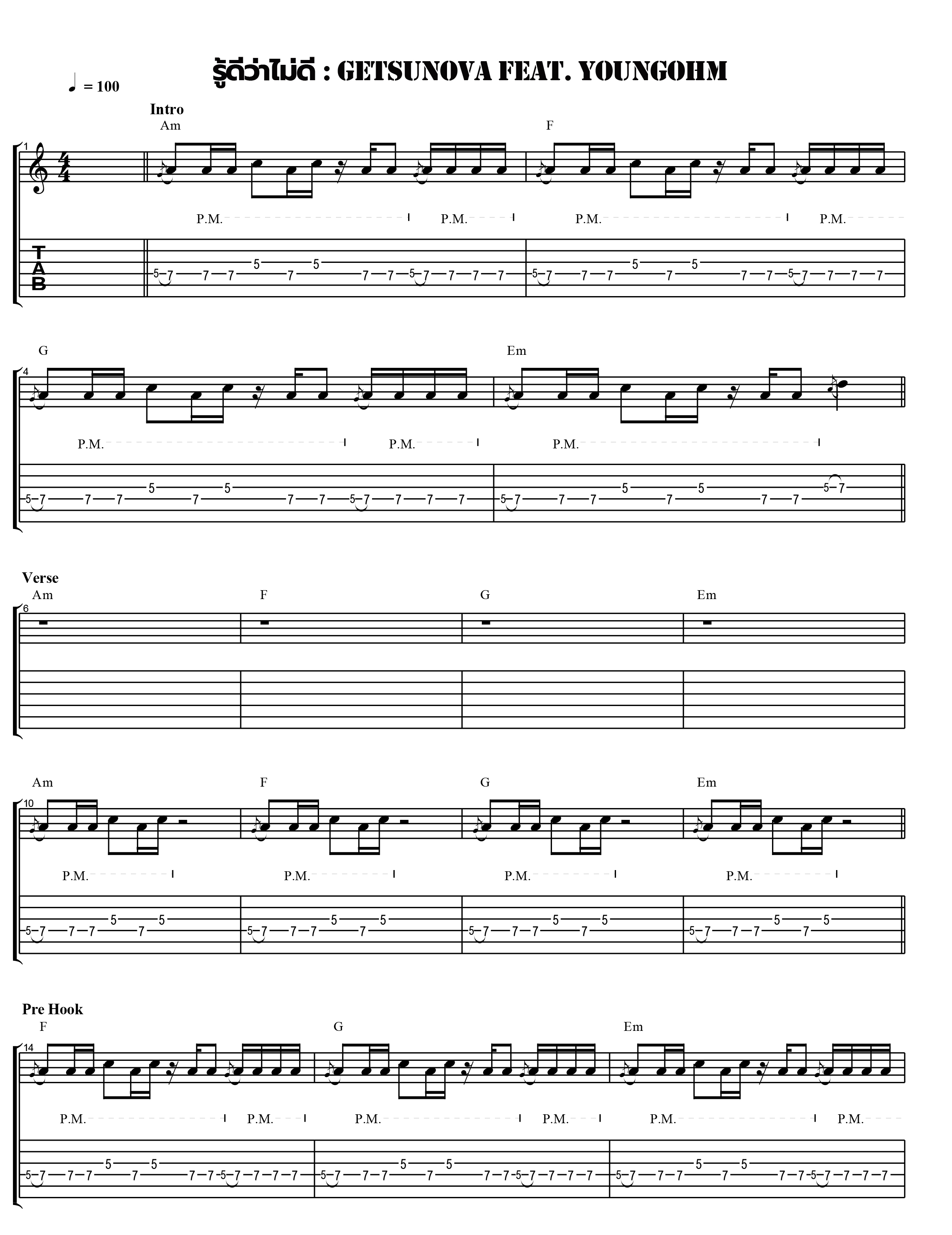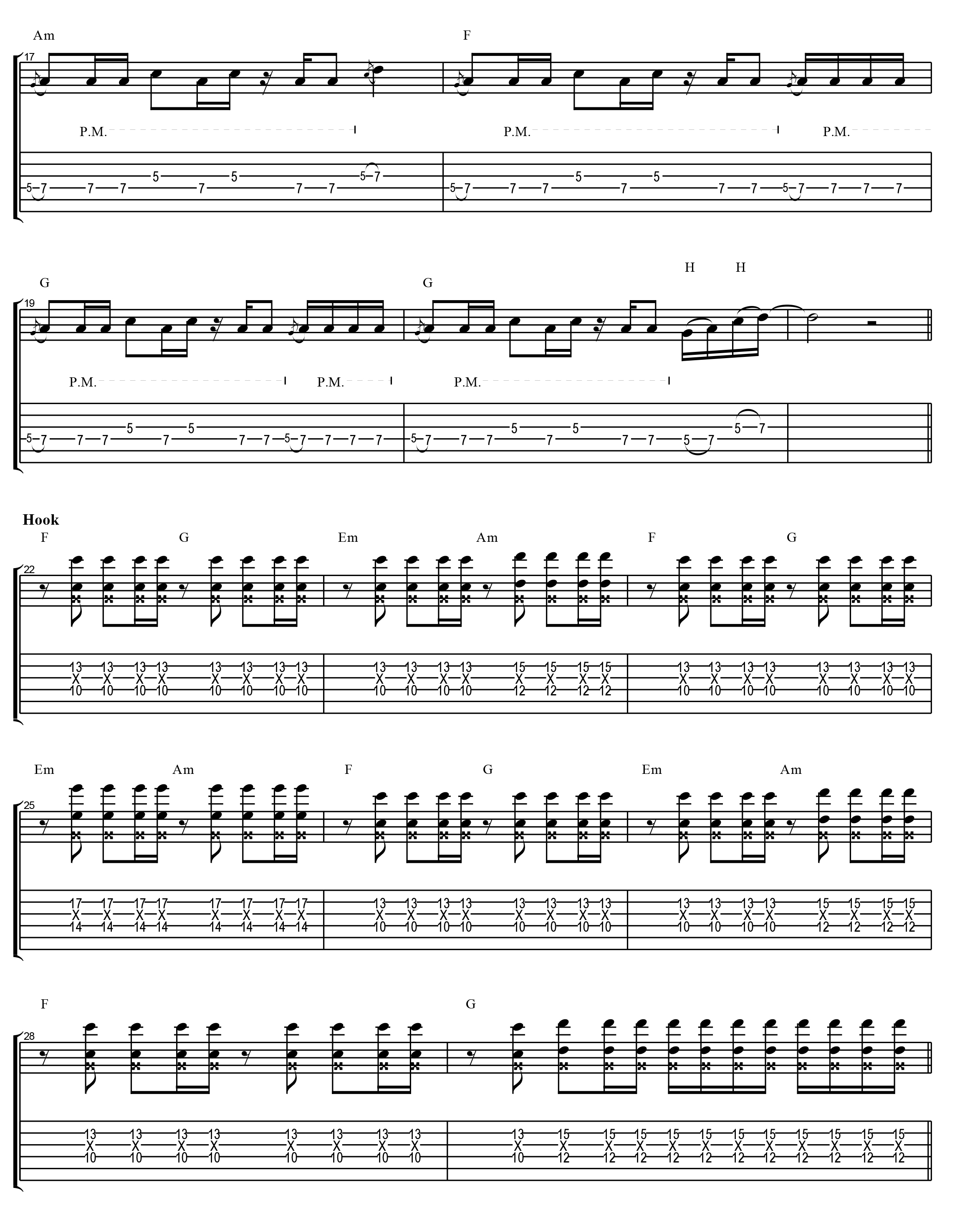 Pre Hook : จะเป็นการเล่นโน้ตแบบท่อน Intro เพียงแต่ว่าคอร์ดในแต่ละห้องจะต่างกันออกไป แต่วิธีการเล่นเหมือนเดิม