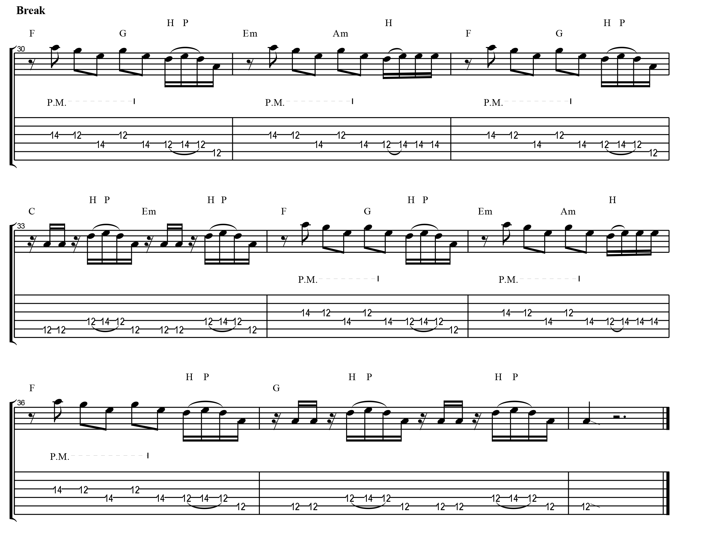 Hook : จะเป็นการเล่น Octave ที่เฟร็ต 10-14 โดยจะไม่เล่นในบีทแรกของห้องจะเป็นจังหวะยกในแต่ละห้อง