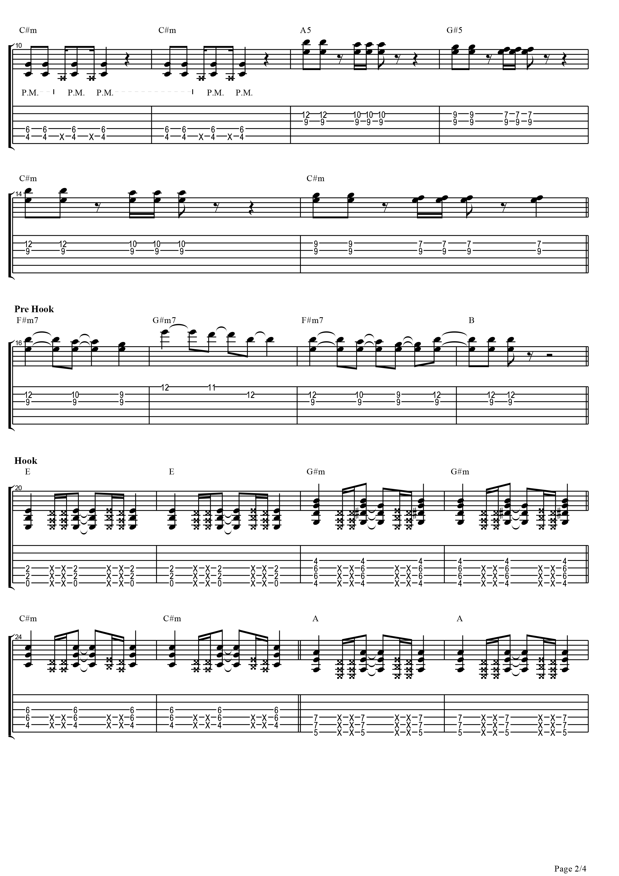 Hook : จะเป็นการเล่น Power Chord กับส่วนโน้ตที่เป็นตัวดำ 1 ตัว เขบ็ต 2 ชั้นทำเสียงบอด ผสมเขบ็ต 1 ชั้น ค้างเสียงโน้ต ไปอีกตัว โดยค่าโน้ตเป็นเขบ็ต 1 ชั้น ทำเสียงบอดเป็นเขบ็ต 2 ชั้น 2 ตัว และเล่นเป็นตัวดำ โดยแต่ละชุด จะเป็นลักษณะส่วนโน้ตแบบนี้