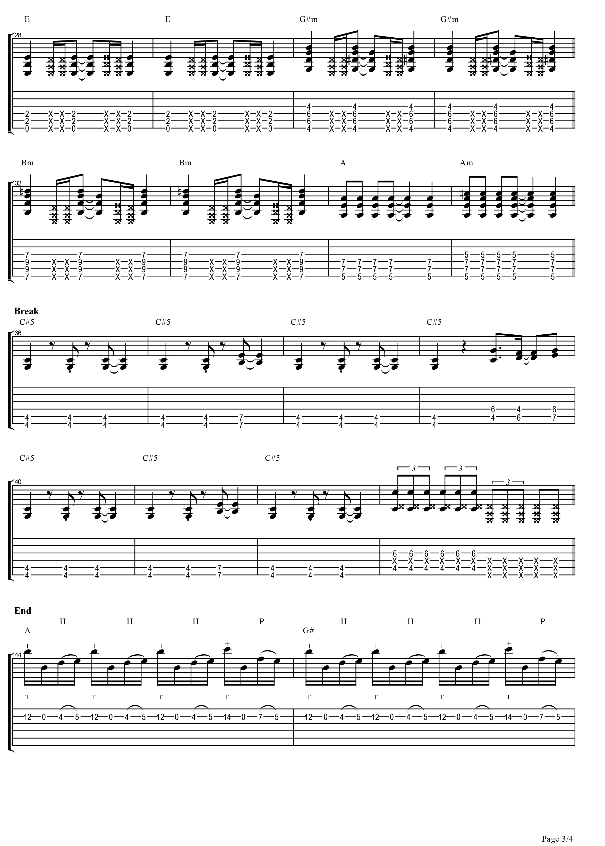 Break : จะเล่นคอร์ดแบบ Power Chord ที่ เบิ้ล คู่ 5 เข้าไปโดยจะมีพวกตัวหยุดค่อนข้างเยอะ ตอนจบเป็นโน้ตแบบ 3 พยางค์