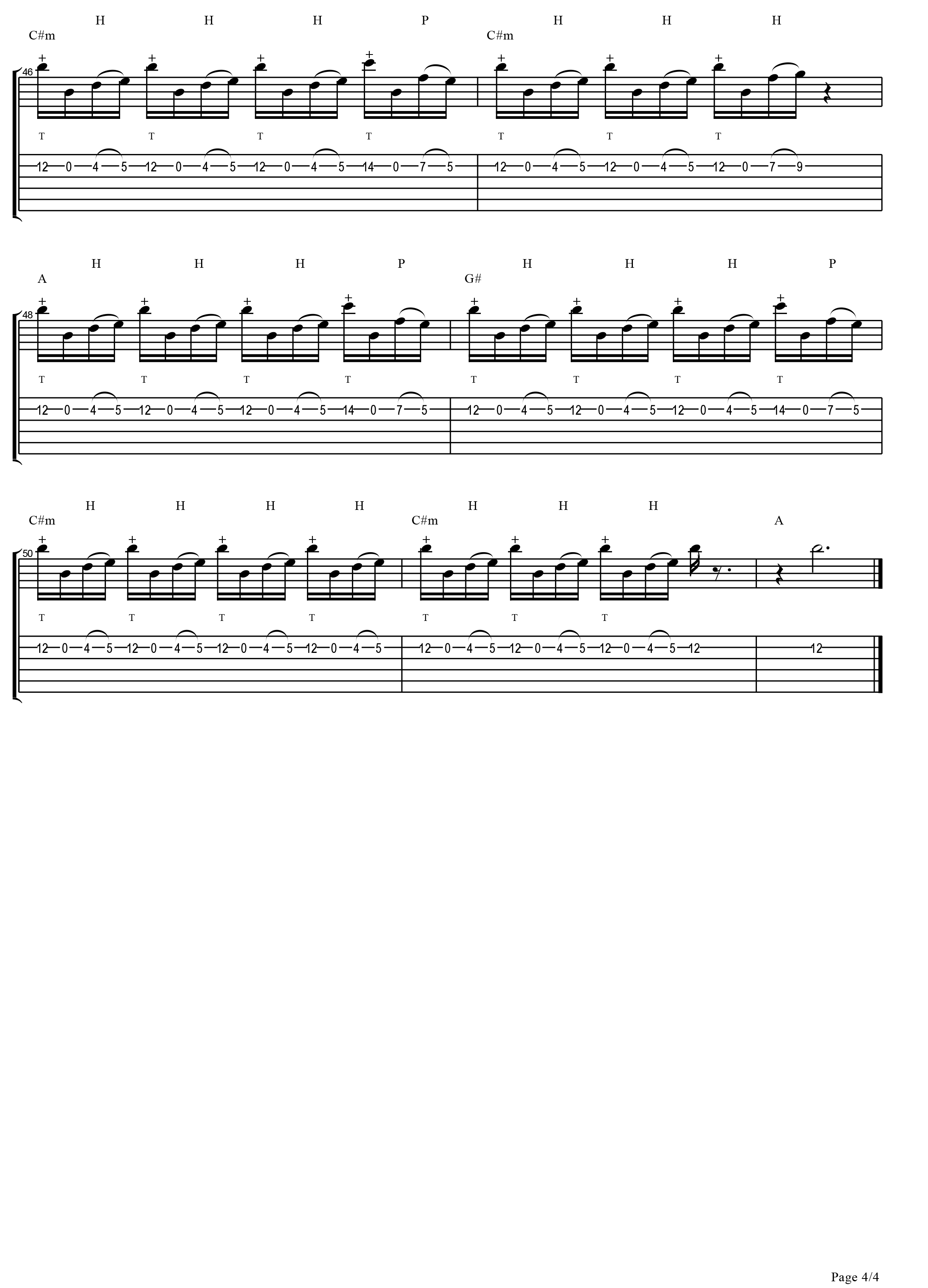 End : ท่อนจบจะเป็น Tapping คล้ายๆ Intro แต่จะมีการเปลี่ยนโน้ต และซ้ำโน้ตเล็กน้อย รวมถึงมีตัวหยุดด้วย ชุดคอร์ด จะแตกตต่างกัน นิดหน่อย