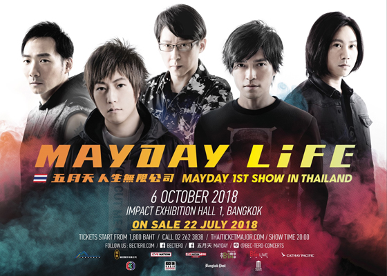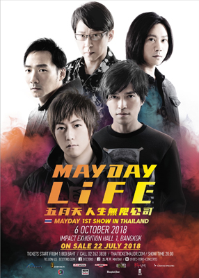 วงร็อคอันดับ 1 ของไต้หวัน “เมย์เดย์” (Mayday) เจ้าของฉายา “เดอะ บีทเทิลส์ แห่งแดนมังกร” และ “ราชาแห่งการแสดงคอนเสิร์ตร็อค” เตรียมระเบิดความมันส์ให้แฟนเพลงชาวไทยได้ประจักษ์ต่อสายตา กับเวิลด์ทัวร์ล่าสุด “ไลฟ์ ทัวร์” (Life Tour) ที่จะจัดเต็มโปรดักชั่นสุดอลังการ ทั้ง แสง สี เสียง ทะลุทุกโสตประสาท พร้อมสุดยอดการแสดงสดอันทรงพลังของพวกเขา ในวันเสาร์ที่ 6 ตุลาคมนี้ ที่อิมแพ็ค เอ็กซิบิชั่น ฮอลล์ 1