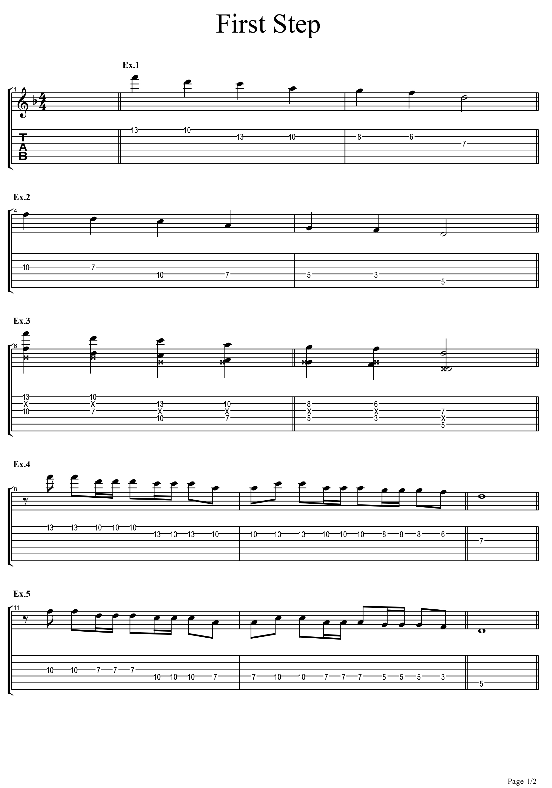 ในท่อน Intro เพลงนี้ จะถูกเล่นโดยสเกล D minor Pentatonic ซึ่งมีโน้ต อยู่ 5 ตัวนั่นก็คือ D F G A C ลองดูตำแหน่งโน้ตในสายต่างๆ และเมื่อมันอยู่บนระดับเสียงที่ต่างกัน จะออกมาเป็นอย่างไร เราจะเริ่มจากเมโลดี้ที่เสียงสูงก่อน
