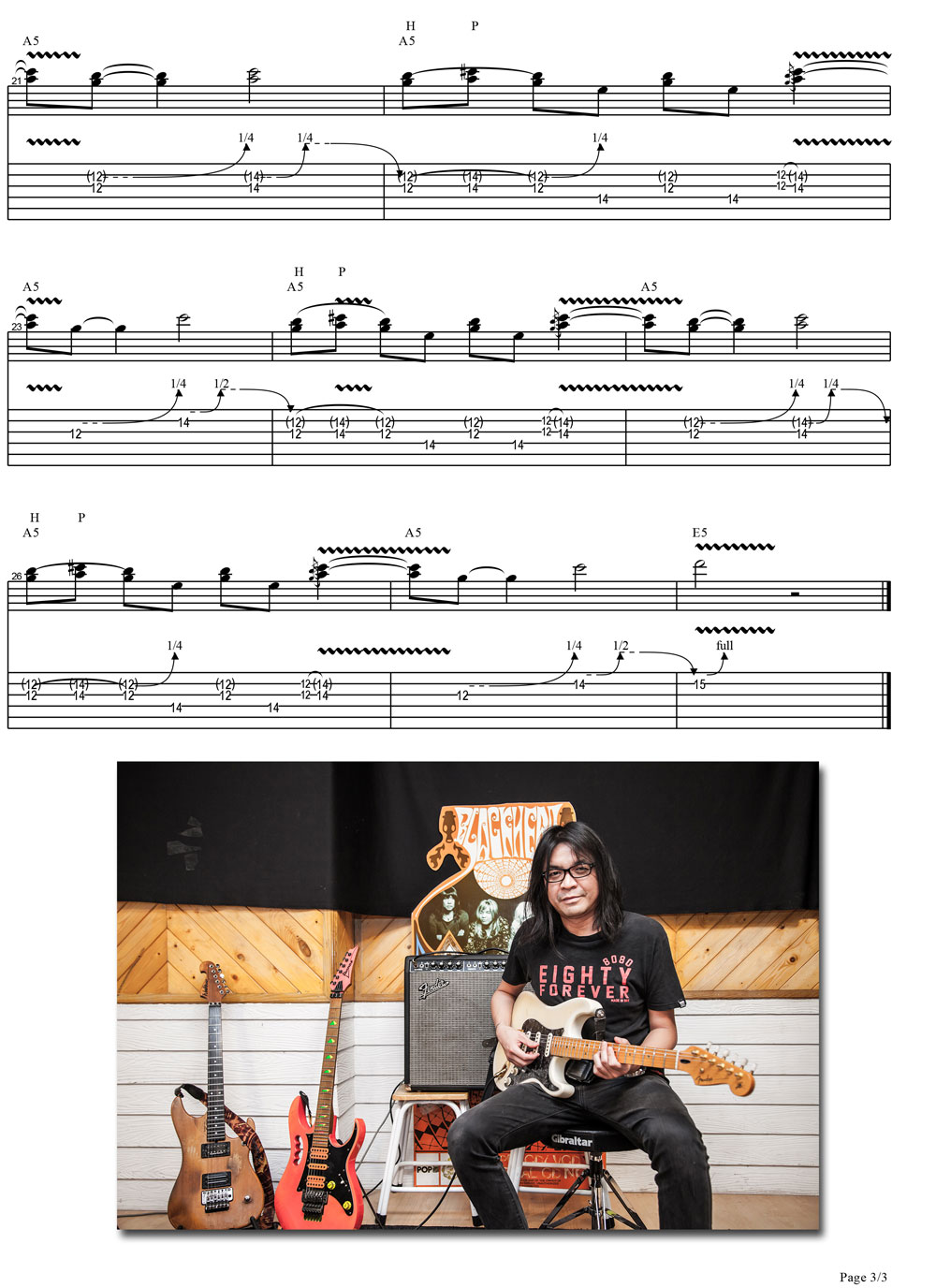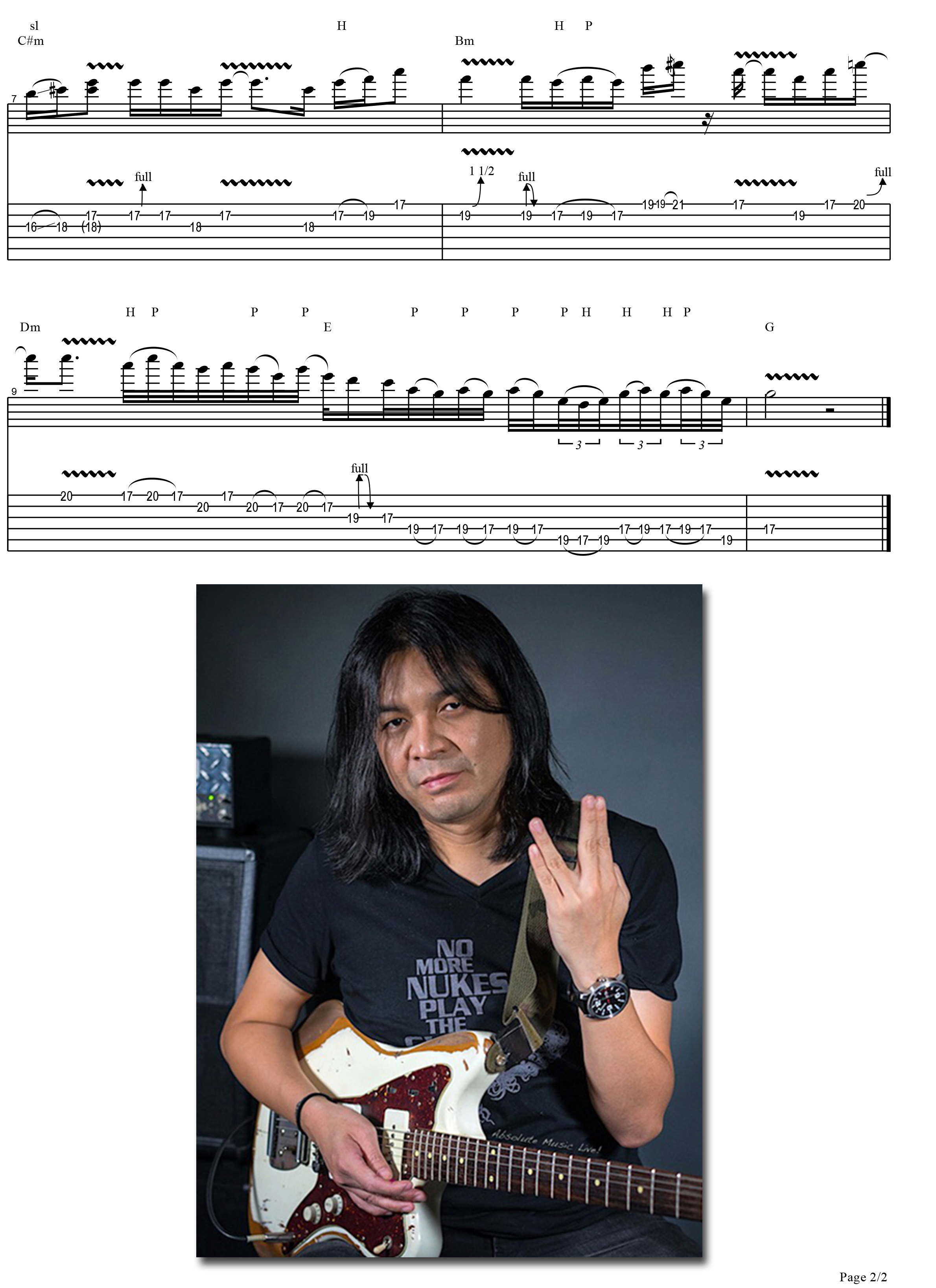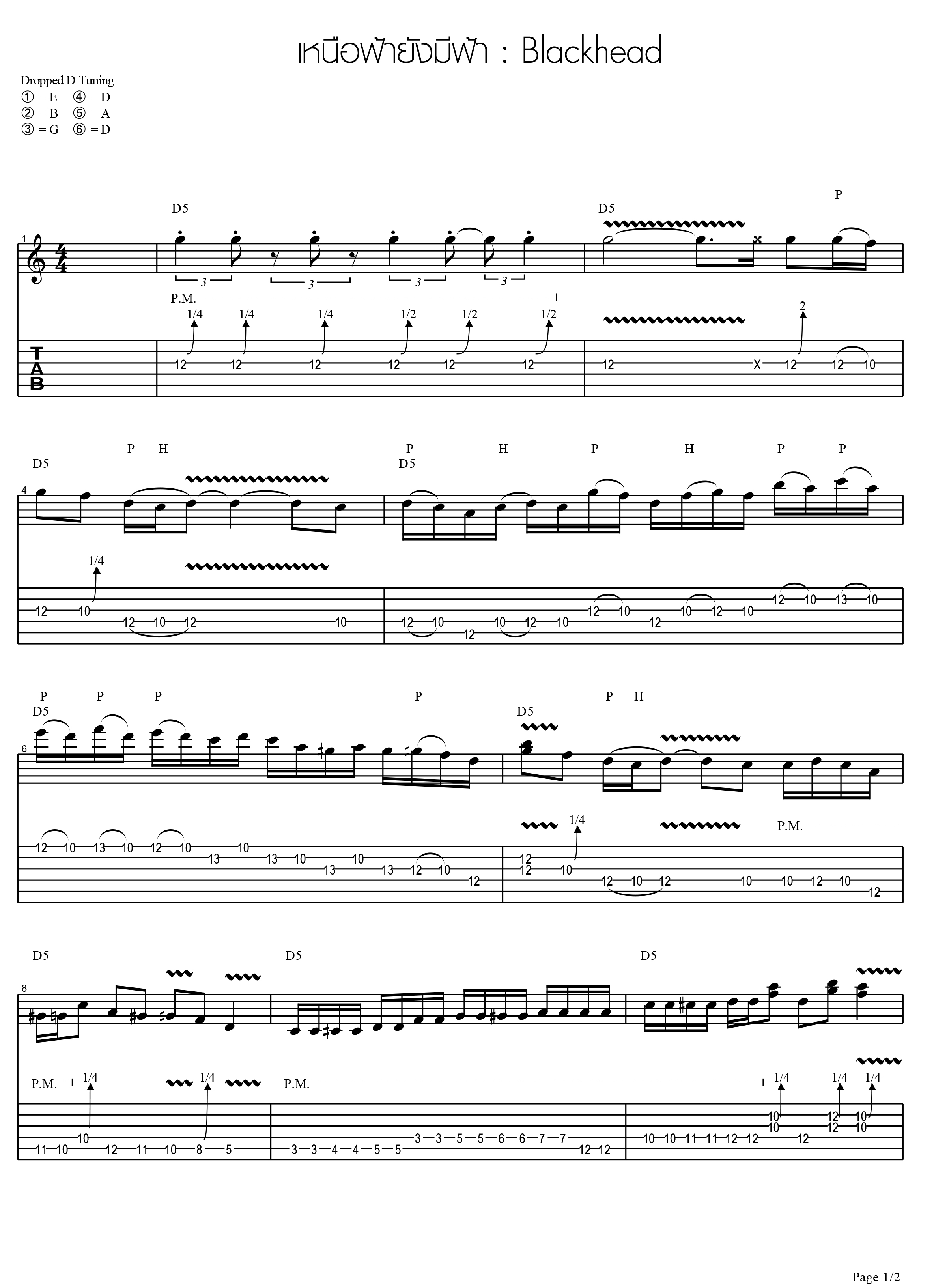 เราลองมาดูพื้นฐานจากเพลงช้าๆ กันก่อน เพลงของ Blackhead ที่ได้รับความนิยมส่วนใหญ่จะเป็นเพลงช้าที่มี “กีตาร์บาดใจ” ซึ่งความเฉียบขาดก็คือการดันสายของเขานั่นเอง เพลงนี้เป็นแบบฝึกหัดการดันสายที่น่าสนใจสุดๆ เริ่มจากการ Modulate คีย์จาก G Major มาอยู่ที่ A Major ดังนั้นเราจะต้องเล่นอยู่ใน Box ของ F# Pentatonic minor และจังหวะจะติด Swing นิดๆ เพลงนี้จะเริ่มจากเมโลดี้ และมาต่อที่การดันสายแบบ Double Stop จากนั้นเล่นเมโลดี้ไปอีกสักพัก จะมีการดันสายที่เรียกว่า Bend And Release ก็คือการดันสาย ขึ้น ลงด้วยโน้ตตัวเดียว ตรงนี้จะยากตรงที่การดันสายที่จะต้องแม่นกับโน้ต จากนั้นจะเป็นเมโลดี้ผสมกับ Grace Note Slide ไปถึงการดันสายเป็น 1 เสียงครึ่ง จะเป็นลักษณะนี้ ไปเรื่อย ดันสาย Double Stop ดันสายและคืนค่าโน้ตเดิม ดันสาย 1 เสียงครึ่ง และจบท้ายด้วยการเปลี่ยนมาเล่น A Pentatonic minor เพื่อสร้างสำเนียง Blues กลับมาเข้าคีย์เดิม