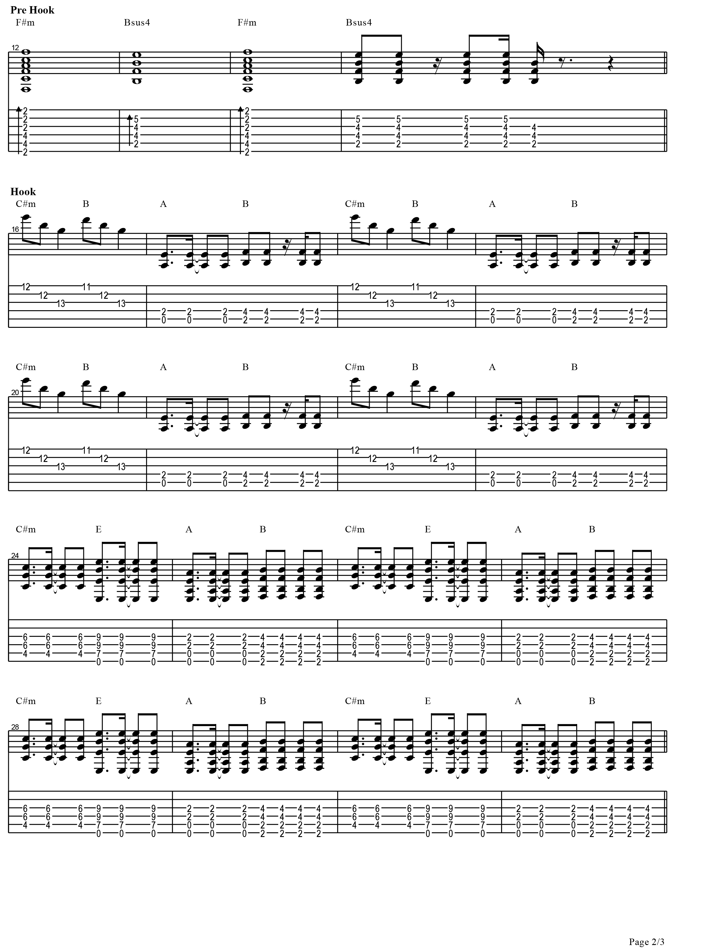 Hook : จะแบ่งเป็น Picking ในสาย 1-2-3 ใน Triad ของ E กับ G#m ผสมกับ Power Chord ช่วงหลังจะเป็น Power Chord ในส่วนโน้ตแบบ เขบ็ต 1 ชั้นประจุด กับเขบ็ต 2 ชั้น ลาก Tie Note แล้วไปเล่นที่เขบ็ต 1 ชั้นของจังหวะยกในบีทต่อไป อีกสองตัวที่เหลือจะเป็นเขบ็ต 1 ชั้น 2 ตัว 1 ชุด