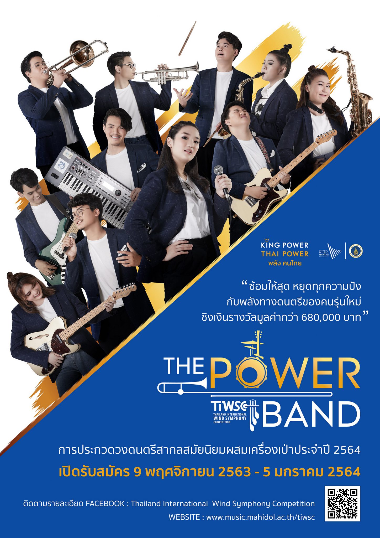 คิง เพาเวอร์ ไทย เพาเวอร์ พลังคนไทย ร่วมกับวิทยาลัยดุริยางคศิลป์ มหาวิทยาลัยมหิดล เชิญชวนร่วมประกวดวงดนตรีสากลสมัยนิยมผสมเครื่องเป่า ประจำปี 2564 ครั้งยิ่งใหญ่แห่งปี ภายใต้ชื่อ The Power Band ชิงเงินรางวัลรวมมูลค่า 680,000 บาท เปิดเวทีให้นักดนตรีไทยได้แสดงศักยภาพทางดนตรีอย่างไร้ขีดจำกัด โดยแบ่งการประกวดออกเป็น 2 ประเภท ได้แก่ ประเภทบุคคลทั่วไป (Class E) ไม่จำกัดอายุ และสัญชาติ ประเภทมัธยมศึกษา (Class F) โดยต้องกำลังศึกษาไม่เกินระดับมัธยมศึกษาตอนปลาย (ต้องอยู่ในสถาบันเดียวกันเท่านั้น) สำหรับการประกวดในครั้งนี้ได้รับเกียรติจากผู้ทรงคุณวุฒิด้านดนตรีแถวหน้าของเมืองไทยร่วมเป็นคณะกรรมการตัดสิน นำโดย พล-คชภัค ผลธนโชติ โปรดิวเซอร์มือทองค่ายเพลง Boxx Music,
