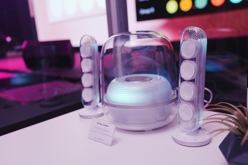 ถัดมาคือลำโพงดีไซน์ไอคอนิก Harman Kardon Soundsticks 5 ที่ยังคงเอกลักษณ์ตัวเครื่องโปร่งใสอันโดดเด่น พร้อมลำโพงแซทเทิลไลต์คู่และซับวูฟเฟอร์ ถ่ายทอดพลังเสียงสเตอริโอ 2.1 พร้อมระบบลำโพงแบบ 3 ทิศทาง ให้เสียงที่ชัดเจน สมดุล และมีมิติ รองรับการเชื่อมต่อ Bluetooth 5.4 และ HDMI ARC เพื่อยกระดับประสบการณ์เสียงจากทีวี การสตรีมมิ่ง และการเล่นเกม อีกทั้งยังมีระบบไฟ Ambient Light ที่เคลื่อนไหวสอดรับกับจังหวะดนตรี โดยมีให้เลือก 2 สี ได้แก่ สีดำและสีขาว ขณะที่ Harman Kardon Soundsticks 5 Wi‑Fi เพิ่มความสามารถในการสตรีมผ่าน Wi-Fi เพื่อคุณภาพเสียงที่ต่อเนื่องและเสถียรยิ่งขึ้น รองรับ AirPlay, Chromecast built-in™ และ Spotify Connect รวมถึงการใช้งานแบบ Multi-room Audio ที่ควบคุมได้ผ่านแอป Harman Kardon One