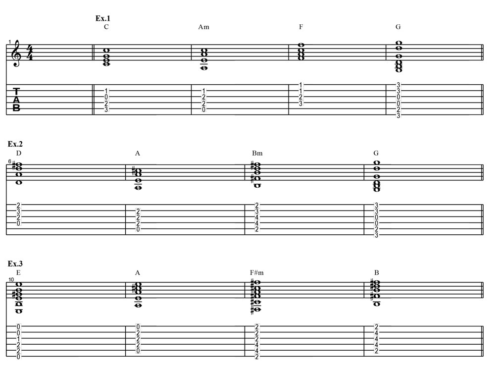 Ex.1 เป็นกลุ่มคอร์ดในคีย์ C Major ที่เราคุ้นเคยกันดีอยู่แล้ว จะมีพวกคอร์ด F คอร์ด G ที่จะดูจับยากกว่าคอร์ดอื่น แน่นอน มันเป็นอะไรที่ทุกๆ คนเห็นเป็นหมื่นๆ ครั้ง แต่คอร์ดเบสิกใน 4 คอร์ด ในช่วงไม่เกิน 4 เฟร็ตนี่แหละ สร้างมือกีตาร์มานับล้านแล้ว ดังนั้นพยายามเล่นให้คล่องตัวนะครับ